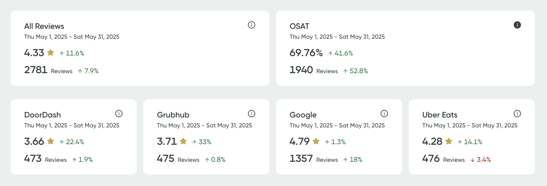 The Insights tab provides a digestible view of written feedback from customers, starting with the Brand Summary. There will be a brand grade followed by a summary of how the last 30 days have gone and any location outliers that need attention.